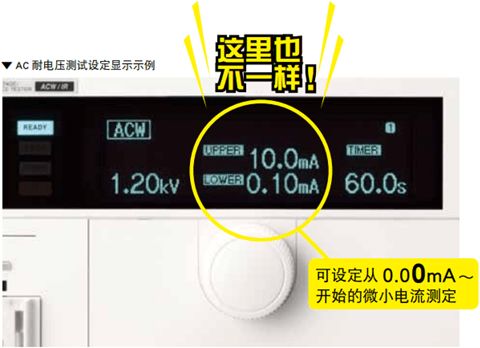 配备了高精确度,高分辨率的True RMS测量回路,电压表为±1.5% of reading(500V以上)/ Min分辨率1μA。另外,配备了自动量程功能,判断精确度也达到了±1.5% of reading。下限判断精确度也实现了和上限判断精确度同等的性能,可以有效地检测出未连接测试导线或接触不良等,同时实现了测试时间为0.1秒的高速判断。通过高精度,高分辨率,高速测量,判断功能能够完成各种可靠的测试。