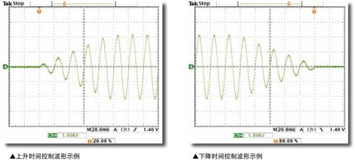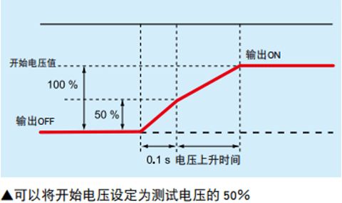 上升时间控制功能 在交流耐电压测试时,配备有缓慢升压至设定电压值的上升时间控制功能。电压上升时间可在0.1s~10.0s范围内按0.1s级别进行设定。 下降时间控制功能 在交流耐电压测试的PASS判断时,可以使测试电压缓慢下降。电压下降时间固定为0.1s(也可以关闭)。