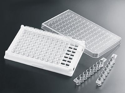 材质 ◆ 板条聚苯乙烯(PS),板框高抗冲击级聚苯乙烯(HIPS),均符合USP Class VI标准。 特点 ◆ 板底厚度均匀、平整光洁、无畸变,孔径大小一致 ◆ 板体透明,光学性能优异,易于显微镜观察 ◆ 8孔排管,可拆卸,满足不同规模实验需求 ◆ 独特的单向盖设计,方便识别,确保操作一致性 ◆ 清晰的字母数字标号,便于区分识别,方便记录 ◆ 可防止交叉污染的孔边设计,防滑且便于拿握,最大限度减小接触面积 ◆ 可层叠放置,节省空间,兼容性好 ◆ 辐照灭菌,SAL 10-6 ◆ 无DNase/RNase,无热原,无细胞毒性 参数信息