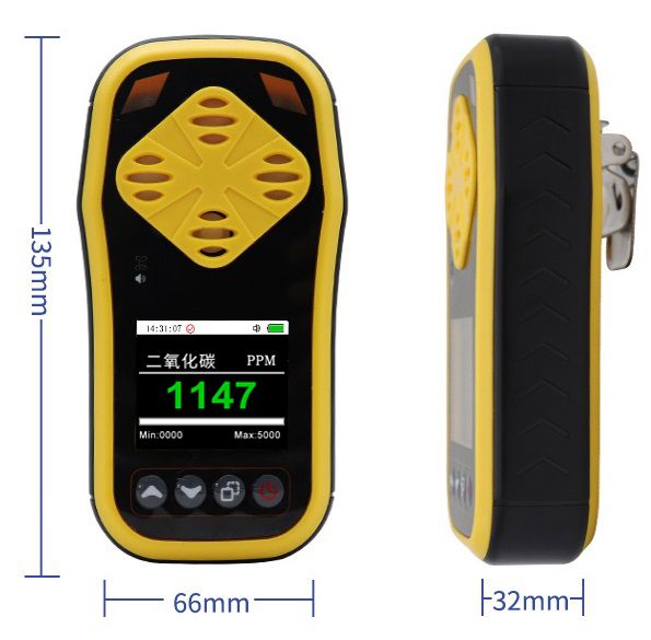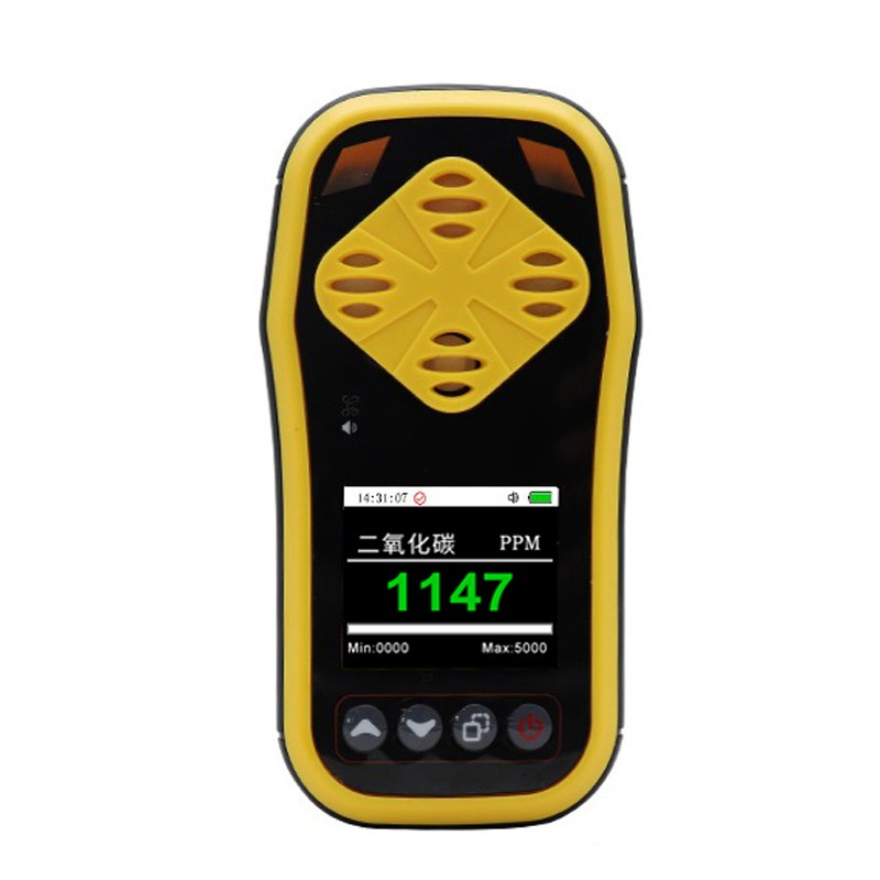 RS-MG41-CO2是我公司针对含有二氧化碳气体的环境研发的一款本安型手持式二氧化碳气体检测仪。 功能特点 采用NDIR红外传感器,基于自然扩散式检测原理,具有极好的灵敏度和出色的重复性。 内置大容量电池,常亮模式下,设备可持续使用至少8小时。 采用带有高清彩屏手持式外观设计,方便实时查看二氧化碳的实时浓度。 具有存储功能,最高可储存检测数据10万条,配合软件可随时查看历史数据。 设备全功能自测试,通过快捷键可开启或关闭声音报警、储存模式、高低限报警值,报警采用声、光、震动三种方式。 技术参数