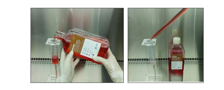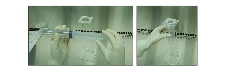 2、取50m注射器一个,拔出推塞,将注射器套筒插入培养袋支架上的圆孔内