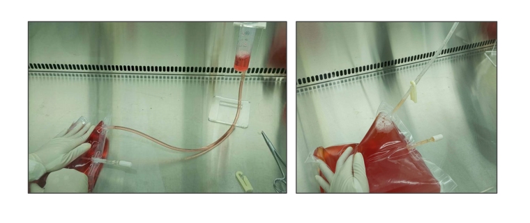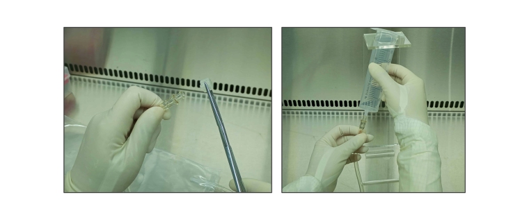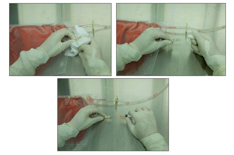 3、将培养袋A端螺口旋下,与注射器套筒连接