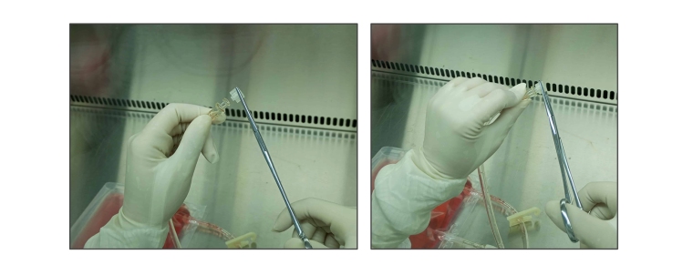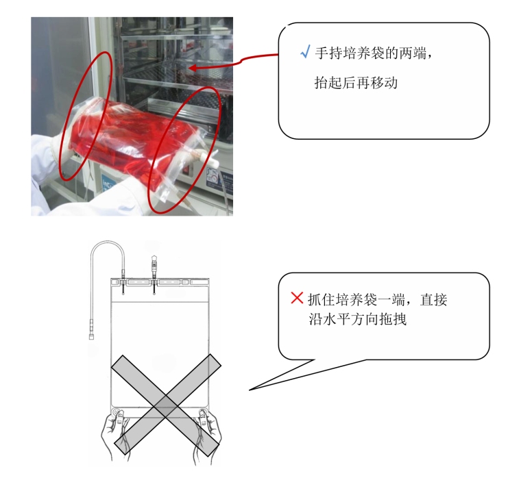 3、将培养袋移入/移出培养箱时,请手持培养袋两端,先向上抬离托盘表面。切忌沿水平方向直接拖拽培养袋,尤其注意C区。