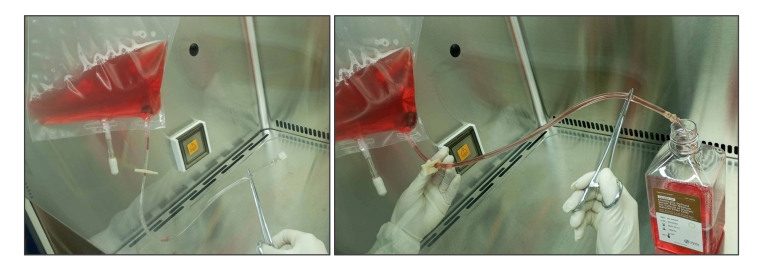 4、由于管路较粗,为避免液体外流,在培养袋内装入培养基后,请将管路顶端拧紧,用卡子卡住,或将管路打一个结,放入培养箱,如图: