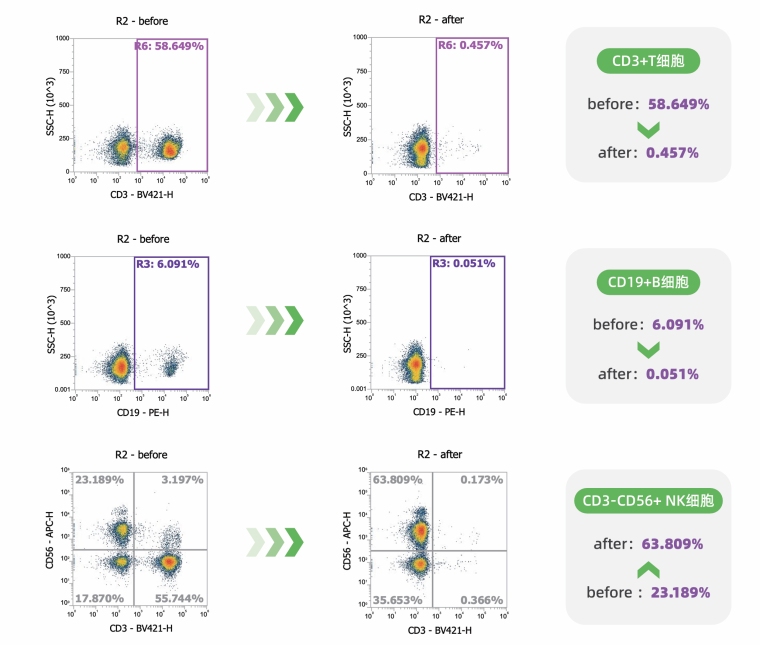 pureSep-NK 通过双抗分子靶向链接红细胞和非目标细胞(T细胞或B细胞等),非目标细胞与红细胞形成细胞团簇复合物经过Ficoll离心沉降,NK细胞保留在上层白膜层,实现快速分离。