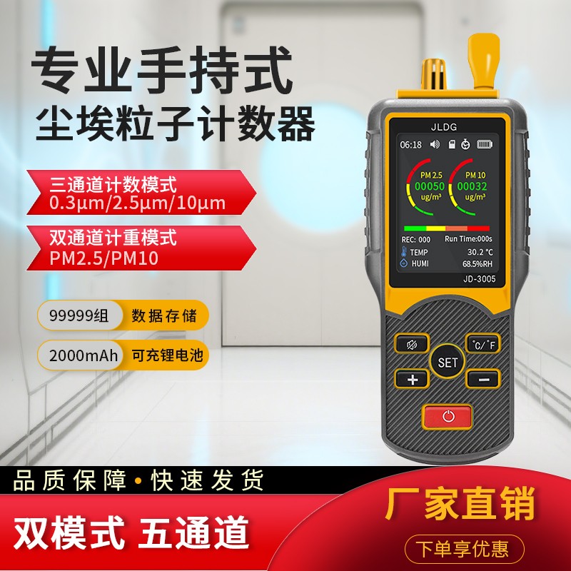 5通道激光尘埃粒子计数器技术参数:颗粒物粒径:0.3μm、2.5μm、10μm、PM2.5、PM10通道数:5通道误差:5%(2000000Particles/ft3)显示屏:2.8英寸全彩显示屏测量单位:计重模式(mg/m³);计数模式(N/L)采样方式:①主动测量 ②默认被动测量记录间隔:默认记录间隔2s,可自定义数值采样周期:①主动测量,开机即不间断测量;②默认被动测量,单次采样180s,不可暂停操作语言:四种语言切换(中文、英文、日文、俄文)报警模式: 超过设定值蜂鸣声报警提示