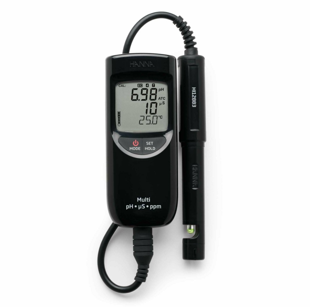 标准配置 主机 HI991300或HI993301、HI12883 专用内置温度传感器 pH-EC-TDS 多参数电极、酸度-电导率标准缓冲液套装、中英文说明书 |