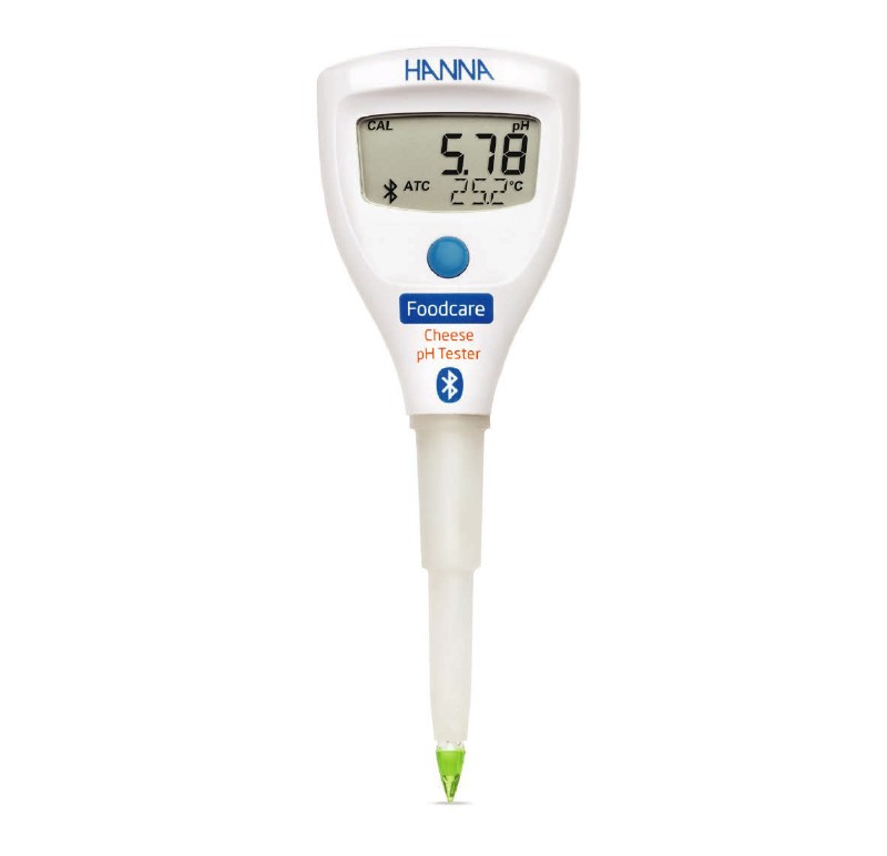测量范围【pH】:0.00 to 12.00 pH,解析度【pH】:0.01 or 0.1 pH,精度【pH】:±0.05 pH 内置专用电极 HALO2奶酪无线pH测试仪准确易用,旨在测量和监测奶酪生产的主要加工步骤中的pH值,并确保其符合食品卫生和危害分析关键控制点(HACCP)的规定。HI9810322可以用作独立的pH测试仪,也可以连接到Hanna实验室应用程序。 •集成的蓝牙模块允许测试仪通过Hanna Lab应用程序连接到兼容的智能设备 •紧凑、防水的外壳,与Hanna Lab应用程序一起使用时,可在最多三点或四点处自动校准pH值 •自动温度补偿读数 产品特点 电极特征 食品级PVDF机身 食品级PVDF机身材料易于清洁和消毒。PVDF主体耐大多数化学物质(如溶剂、次氯酸钠)、紫外线和真菌生长,还具有高耐磨性和机械强度。 快速、稳定的读数 双结设计提供了一种与样品相互作用的无银电解质溶液,使电极不易堵塞,并保证快速响应和稳定读数。 内置温度传感器 pH电极尖端的内置温度传感器允许快速测定样品温度和高精度的温度读数。 技术参数
