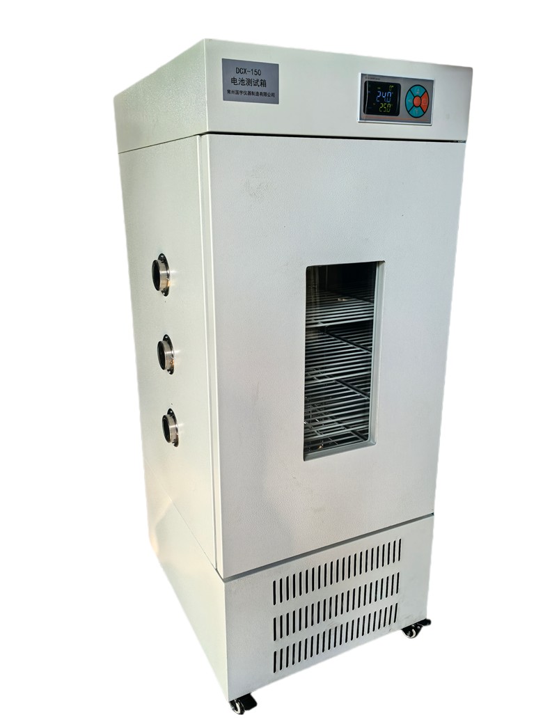 DCX-150电池测试箱具有制冷和加热双向调温系统,温度可控的功能,是电池测试实验等常用设备。 DCX-150电池测试箱产品特点: 1、箱体冷轧钢板沖制而成,表面喷塑处理,内胆采用不锈钢板制成。内胆与外壳之间采用岩棉填充保暖。箱门中部装有玻璃观察窗,便于用户随时观察工作室内物品试验情况。箱体内有冷、热气流风道使箱内气体循环流畅、温度更加均衡。 2、温度采用集成电路控温,大屏幕LCD液晶显示,界面清晰,操作人性化,控制精度高。