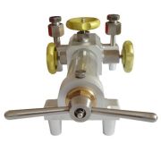 ZHT-6440(LYL-400) 0~40Mpa 氧气表压力表两用校验器 氧气表压力表两用校验器适用于各级计量定检机构及工矿企业,采用比对法检定普通压力表及其他禁油类压力表. 本校验器采用手压杆杠作用下的柱塞泵产生压力,设置二级油水隔离装置,通过油路和水路传递压力,既可检定压力表,也可检定氧气表,一机两用.本机具有结构合理,操作简便,性能稳定,安全耐用等优点. 氧气表压力表两用校验器简介: 氧气表压力表两用校验器适用于各级计量定检机构及工矿企业,采用比对法检定普通压力表及其他禁油类压力表. 本校验器采用手压杆杠作用下的柱塞泵产生压力,设置二级油水隔离装置,通过油路和水路传递压力,既可检定压力表,也可检定氧气表,一机两用.本机具有结构合理,操作简便,性能稳定,安全耐用等优点.