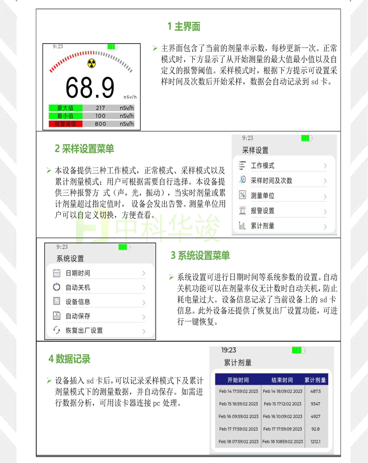 HJ1200环境级X、γ辐射测量仪是监测各种放射性工作场所γ射线辐射剂量率的通用仪器。采用国产Espressif公司超低功耗处理器方案,与同类仪器相比本仪器具有更宽的剂量率测量范围,良好能量响应特性。该仪器广泛用于医疗、疾控、环保、冶金、石油、化工、放射性试验室、商检、工业探伤、辐射加工、矿山等各种需进行辐射环境与辐射防护检测的场合。 参数指标 探测器Φ25×25MM,NaI 闪烁晶体 灵敏度1µGy/h≥700CPS@35keV 测量范围 r剂量率:0.01uGy~10mGy/h 相对误差不超过±15% 测量时间1秒-200秒可自由编程 能量响应 -10%---+10%(测量条件在48keV-1.5MeV,Cs-137) 报警阈声光振动三种报警方式,0-200nSv/h可编程 显示单位剂量率:Sv/h、Gy/h、R/h 计数率:CPS; 电源功耗3350mAh充电电池,整机功耗小于20mW 重量1kg 尺寸24×20×8.4(cm) 工作温度-20~+60℃ 工作湿度≤90%RH 功能介绍