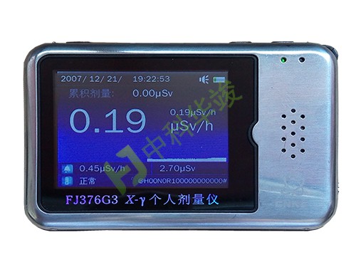 FJ376G3 Xγ个人剂量仪是一款小型高灵敏度的个人辐射剂量报警仪。该仪器采用G-M计数管作为探测器反应速度快;并采用功能较强的单片机技术,具有很强的抗干扰能力。主要用来监测X射线和厂射线在测量范围内,可任意设定报警闻值,当达到报警阑值时,发出警 报及时提醒工作人员注意安全。