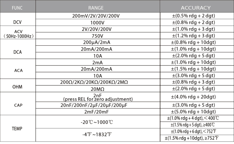 熔断器保护:uA, mA等级:陶瓷熔断器F1 200mA/250V 10A级:陶瓷熔断器F2 10A/250V 电源:1.5V AAAX3电池工作温度、湿度: 0~40℃/32~104℉,45% ~ 80% rh; 储存温度和湿度:-20~60℃/-4~140℉,45% ~ 80% rh; 安全等级:IEC61010-1, CATⅢ600V 尺寸:195(长)x92(宽)x52(高)毫米。 重量:约380克(含电池)