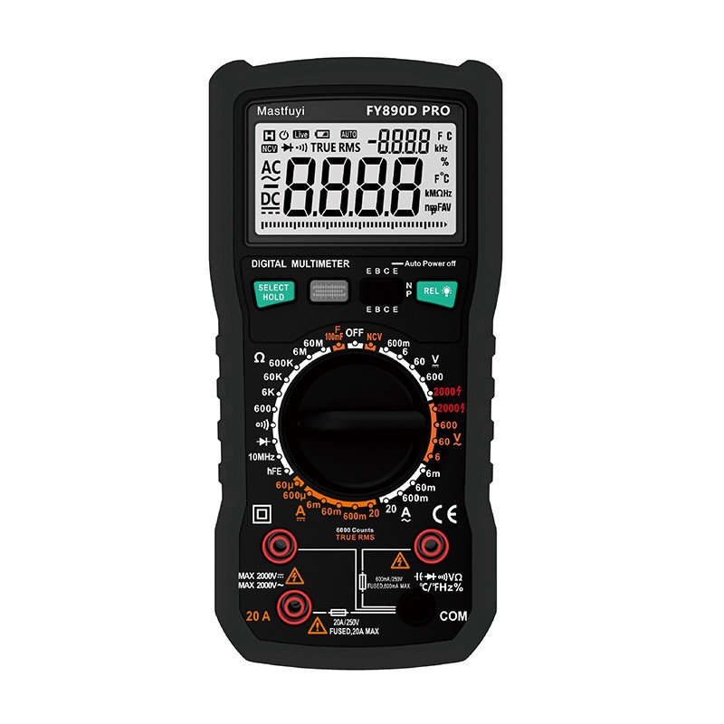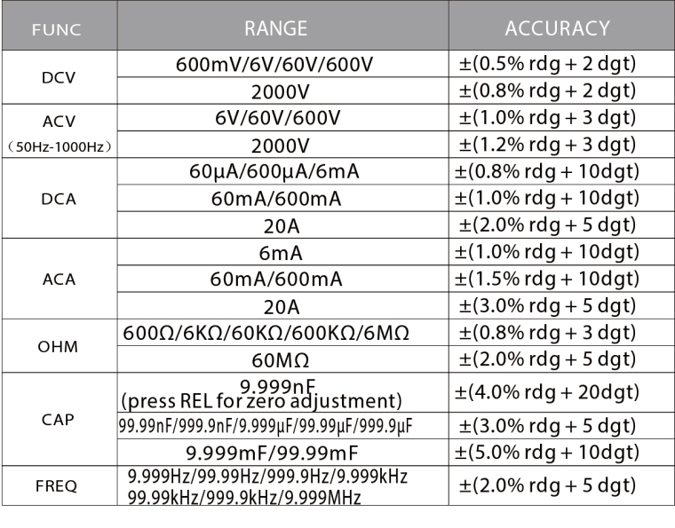 规格 安全等级:IEC61010-1, CAT II 1000V或CAT III 600V LCD显示,最多6000个。阅读5999 过载保护:PTC在欧姆范围 保险丝:600mV/250V, 10A/250V陶瓷 极性显示:自动,“-”为负极 低电量指示: 电池:9V x1, NEDA 1604或6F22 尺寸:195×92×52毫米 重量:约380g(含电池)
