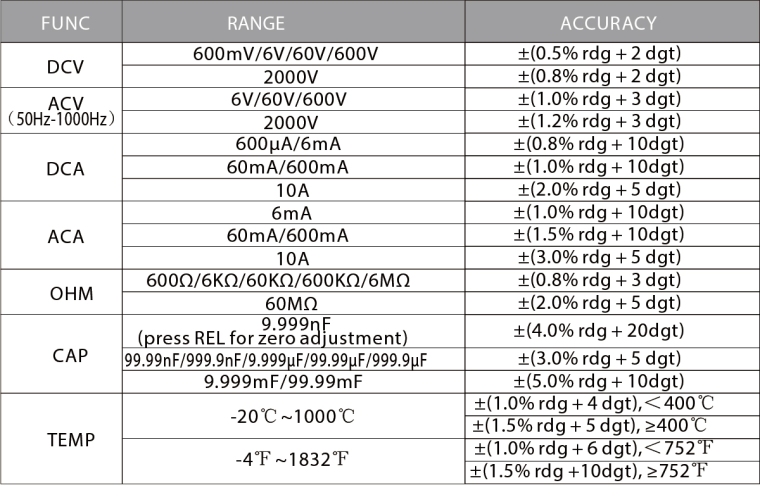 规格 安全等级:IEC61010-1, CAT II 1000V或CAT III 600V LCD显示,最多6000个。阅读5999 过载保护:PTC在欧姆范围 保险丝:600mV/250V, 10A/250V陶瓷 极性显示:自动,“-”为负极 低电量指示: 电池:9V x1, NEDA 1604或6F22 尺寸:195×92×52毫米 重量:约。380g(含电池)
