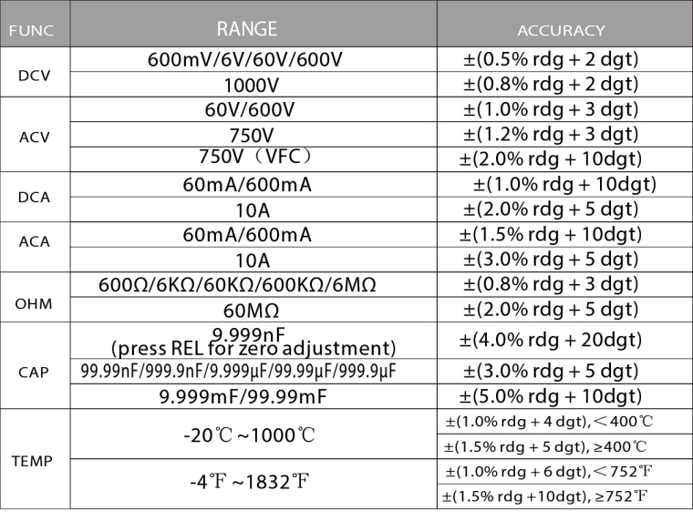 规格 安全等级:IEC61010-1, CAT II 1000V或CAT III 600V LCD显示,最多6000个。阅读5999 过载保护:PTC在欧姆范围 保险丝:600mV/250V, 10A/250V陶瓷 过载指示:“OL”或“OL” 极性显示:自动,“-”为负极 工作温度/湿度:0~40℃,45%~80%RH 储存温度/湿度:-20~60℃,45%~80%RH 低电量指示: 电池:1.5V x3, AAA 尺寸:183×90×51毫米 重量:约286g(含电池)