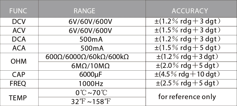 规格 工作环境条件:600V CAT.Ⅲ 污染等级:2 工作环境温度、湿度: 0 ~ 40℃(< 80% RH, < 10℃不考虑)。 储存环境温度、湿度: - 10 ~ 60℃(< 70% RH,取出电池)。 测量之间的最大允许电压 终端和 接地:600V直流或600V交流有效值 转化率:约3次/秒 超量程指示:LCD显示“OL”。 电源:3节1.5V AAA电池 外形尺寸:162(长)× 80(宽)× 24(高)mm 重量:约232g(不含电池)