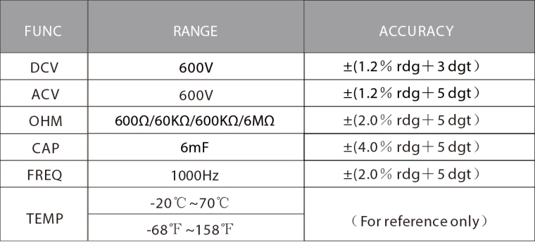规格 工作环境条件:600V CAT。Ⅲ 污染等级:2 工作环境温度、湿度: 0 ~ 40℃(< 80% RH, < 10℃不考虑)。 储存环境温度、湿度: - 10 ~ 60℃(< 70% RH,取出电池)。 测量之间的最大允许电压 终端和 接地:600V直流或600V交流有效值 转化率:约3次/秒 超量程指示:LCD显示“OL”。 电源:锂电池 外形尺寸:162(长)× 47(宽)× 26(高)mm 重量:约125g(含电池)