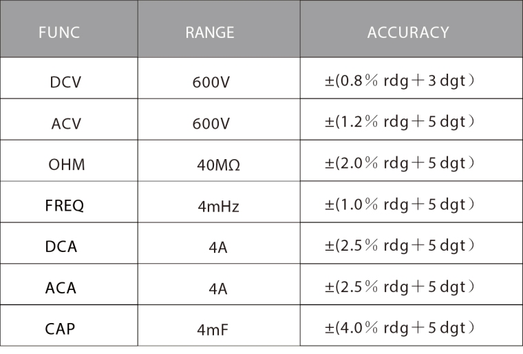 规格 电压标准:CAT II 600V 显示方式:3999位LCD显示 工作温度:-10~50℃ 电池规格:2x1.5V AAA电池 外形尺寸:117x56x25mm 重量:约91g(不含电池)