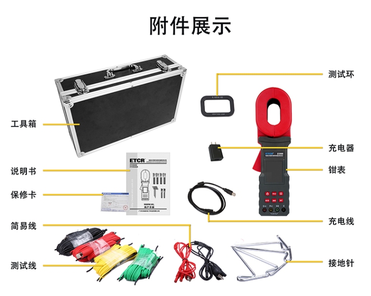 随机附件 | 钳形表:1件;测试环:1件;USB充电线:1条;充电器:1件;接地针4件;测试线4条;简易测试线2条;工具箱:1件 |