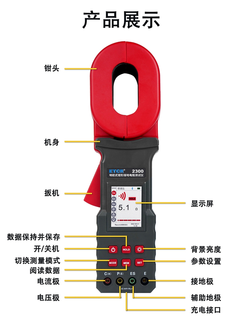 ETCR2300地桩式钳形接地电阻测试仪是一款多功能产品,是钳形电阻测试仪和数字接地电阻测试仪的结合,功能强大,能测接地电阻测量、回路电阻测量、土壤电阻率测量、对地电压测量,接地引下线漏电流测量,判断接地故障。