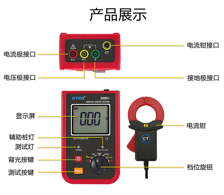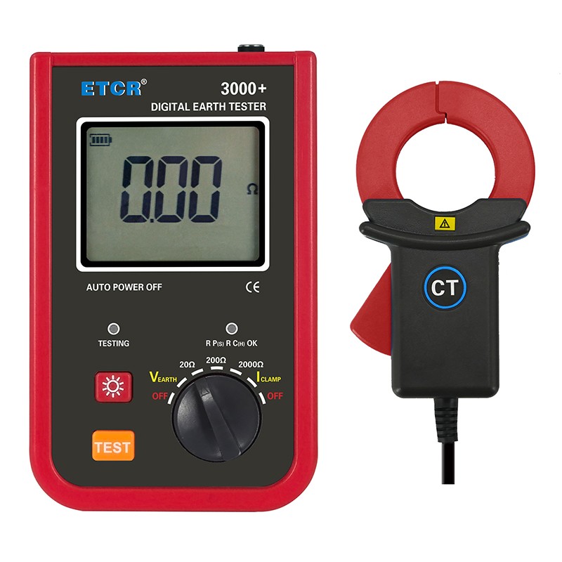 ETCR3000+ 数字式接地电阻测试仪由主机、电流钳、测试线等组成。具有自动关机功能、仪表全量程自动换挡、抗干扰能力强、操作更简易。其广泛应用于电力、电信、气象、油田、建筑、防雷及工业电气设备等的接地电阻测量。