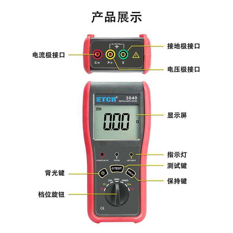 ETCR3040 接地电阻测试仪是一款2025年上市的手持式接地电阻测试仪新品,外观小巧,5秒快速检测出结果的接地电阻测试仪。