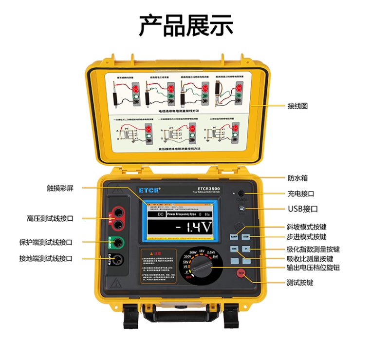 一.简介 ETCR3500系列高压绝缘电阻测试仪是我公司精心研发的一款高性能高压绝缘电阻测试仪,仪表拥有完善的各种绝缘电阻指标测试功能、自设测试电压功能、良好的抗干扰能力,在变电站等有强感应电环境下、以及在分布电容较大的使用场景下具有明显优势。仪表采用真彩触摸屏,所有测试数据及电池电量同屏显示一目了然,旋钮开关和按键组合使得操作非常简单。用户无需费力记忆操作方法,点击屏幕的“HELP”即可弹出操作方法,有效指引用户操作仪表。产品适用于大容量、高压、强感应电环境下电气设备、输电线路等大型设备的绝缘电阻测试。是电力、电信、气象、机房、油田、机电安装和维修以及工矿企业供电部门常用而必不可少的仪表。 仪表的测试计时器自动记录测试时间、存储含有日期时间的测试结果,触摸屏可以非常方便的查阅记录的历史数据,完全隔离的USB接口和蓝牙通信可将测试数据安荃的上传到PC机或手机,供用户进行数据分析。仪表配置带有双层绝缘及屏蔽层的测试线,高压棒配有可更换的鳄鱼夹及钩子,可适应各种测试场所。仪表采用坚固的双层外壳结构,仪表外箱防护等级IP65,能防止运输存储过程中水分灰尘的侵入及防止撞击有效保护仪表。 二.产品特点: 1.5寸触摸彩屏,测试数据同屏显示。测试操作及查询历史记录非常方便。 2.绝缘电阻量程:0.005MΩ~10TΩ。 3.输出额定电压zui多达7档(50V,250V,500V,1kV,2.5kV,5kV,10kV)。 4.zui大短路电流:5mA。 5.输出功率大,抗干扰能力强,在分布电容较大的场景下(如长电缆线),以及强电磁干扰环境下(如变电站),具有稳定的测试能力。 6.完善的测量指标:绝缘电阻(IR)、极化指数(PI)、吸收比(DAR)、步进(STEP)、斜坡(RAMP)、交直流电压(V)。 7.自设置测量模式,可选择PI、DAR计算公式,为用户提供多种选择。 8.自设电压模式:可自由设定测试电压及测试时长,方便特殊场景需要。 9.电压监视器:自动监测被测物带电电压。电压超过36V自动禁止测试有效保护仪表和操作人员。 10.自动放电功能,测试后自动快速释放被测物的充电电荷,无需外加放电回路。 11.大容量充电锂电池组14.8V 5200mAh。以保障长时间测试工作。 12.大容量测试记录存储器,测试记录可在本仪器直接浏览分析。可自动存储具有测试日期、测试计时的实时测试数据共1000组。 13.USB通信上传功能,记录数据可上传电脑进行存储数据统计分析。 14.蓝牙通信功能,可将测试结果上传到手机。 15.双层外壳结构,坚固耐用,防护等级IP65。 三.绝缘电阻测试精度