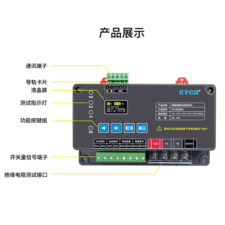 ETCR3580C绝缘电阻在线监测仪系列采用更清晰OLED液晶屏,测试参数可在仪器按键或后台设置,安装方便,测试可靠,广泛应用于电信、电力、气象、机房、油田、工矿企业等重要场所对绝缘电阻的在线监测。