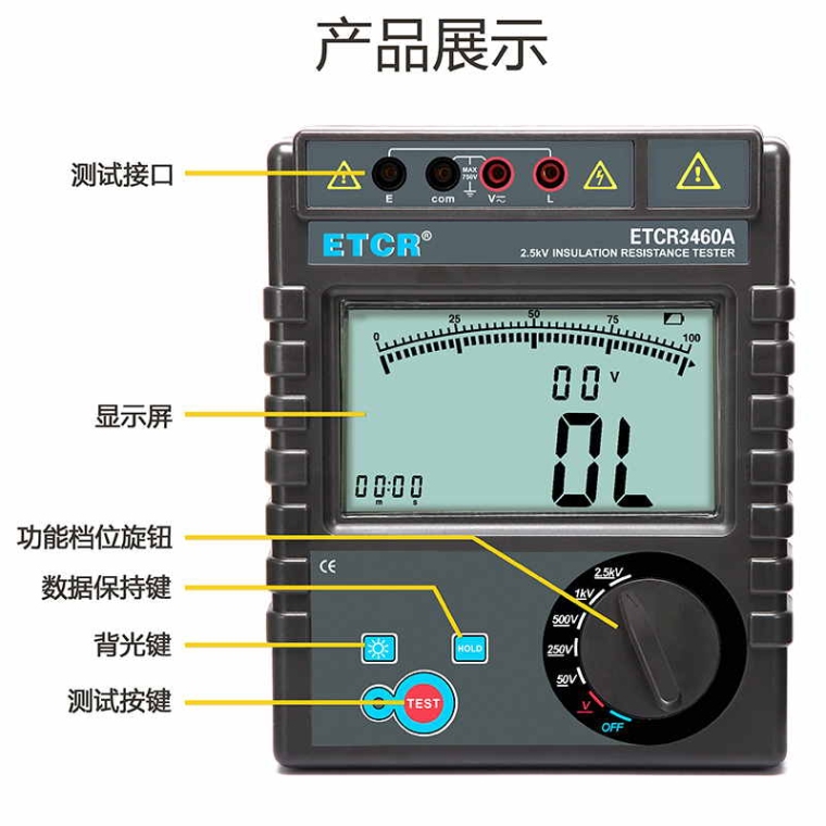 ETCR3460A绝缘电阻表又名兆欧表、绝缘电阻测试仪,用于绝缘电阻测试。仪表具有LCD大屏幕带背光显示、数据保持、自动放电、自动关机等功能。仪表具有测试计时,电压监测功能,回路电压大于36V时,仪表将禁止测试以保护被测物及人员**。仪表功能操作简易,绝缘电阻值,测试时间,输出电压同屏显示,具备交流电压、直流电压测试功能。