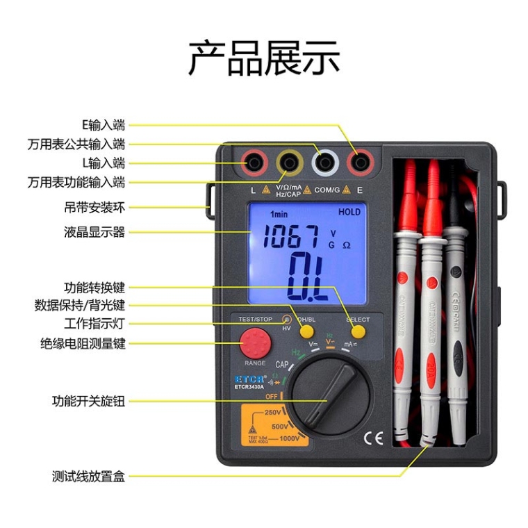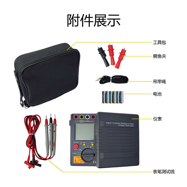 本产品是一款绝缘电阻万用表。其功能齐全,准确度高、操作可靠、使用方便。绝缘测试电压可切换。普通绝缘电阻表不能测量自身输出的高压,在绝缘电阻表输出高压不符合额定值时,用户不容易发现,以至有时测量结果偏差过大,造成**隐患,可适时监测输出高压,用户在任何时候都能观察到仪表实际输出的测量电压,有效避免因输出电压不符合额定值要求而造成的误判。仪表测量范围*高可达到40GΩ,可根据需要设置测量时间,测量完毕后自动保持测量结果。数字多用表功能有交直流电压、电流、电阻、电容、频率、二极管及通断测量等,数字万用表功能和绝缘电阻表功能是完全分开的,在使用万用表功能时,不必担心会被绝缘电阻表产生的高压电击。本产品适用于测量变压器、电机、电缆、开关、电器等各种电气设备及绝缘材料的绝缘电阻,对各种电气设备进行保养维修、试验及检定。它结构精巧,携带方便,是您理想的电工、电子测试仪表。 产品特点 1. 绝缘电阻表与万用表的**结合,绝缘电阻测试与数字万用表相互分开,测试时互不影响。 2. *大输出电压2500V,*大测试阻值40GΩ,短路电流≥1mA。 3. 绝缘电阻值,测试时间,输出电压同屏显示。 4. 结构精巧、准确度高、操作简单可靠、携带方便。 技术参数