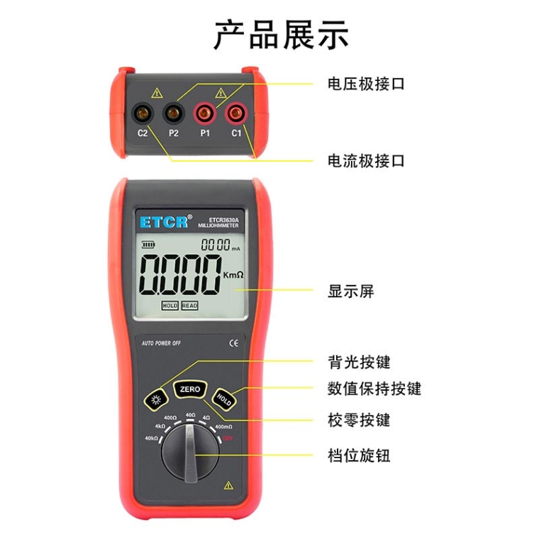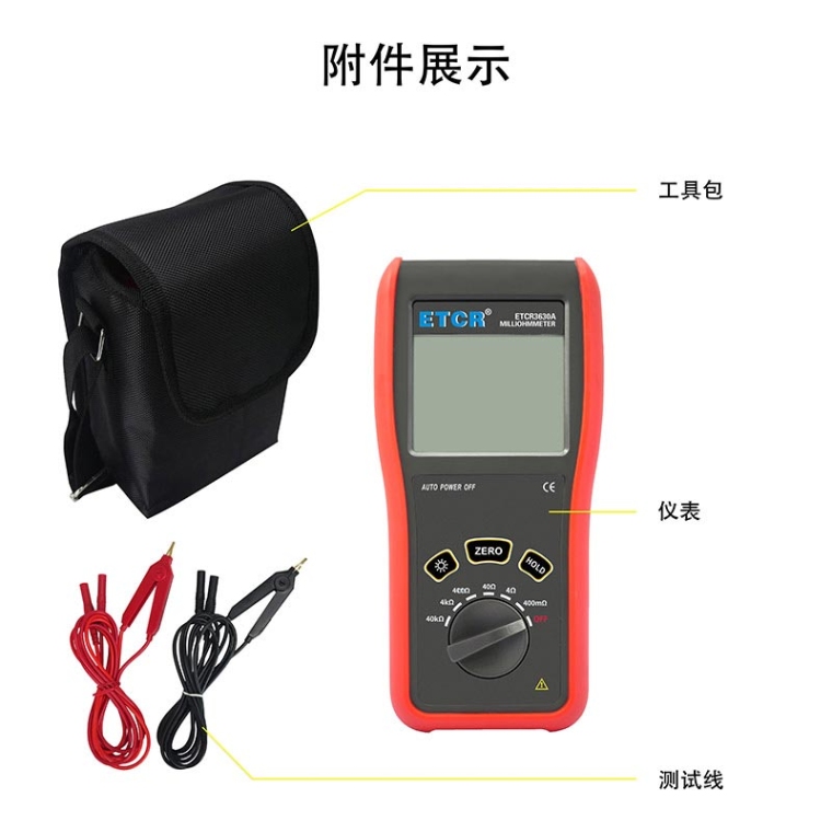 ETCR3630A便携式毫欧计又称直流低电阻计、直流电阻测试仪,欧姆计,仪表采用微处理机技术,四线法测试,**精密可靠。主要用于测量电缆的导线电阻,开关、接插件、继电器的接触电阻,线圈、电动机、变压器绕组的直流低电阻,金属铆接件金属构件之间,地网地极连接导体间的联接电阻。仪表广泛应用于工矿企业、建筑监测监理公司、建筑施工单位、防雷公司、电力部门、船舶机车厂等。ETCR3630A便携式毫欧计由主机、测试线组成。主机大屏LCD显示,一目了然。能存储1000组数据,电阻测量范围:0.1mΩ~40.0kΩ,*大测试电流:100mA,仪表操作简易,携带方便。