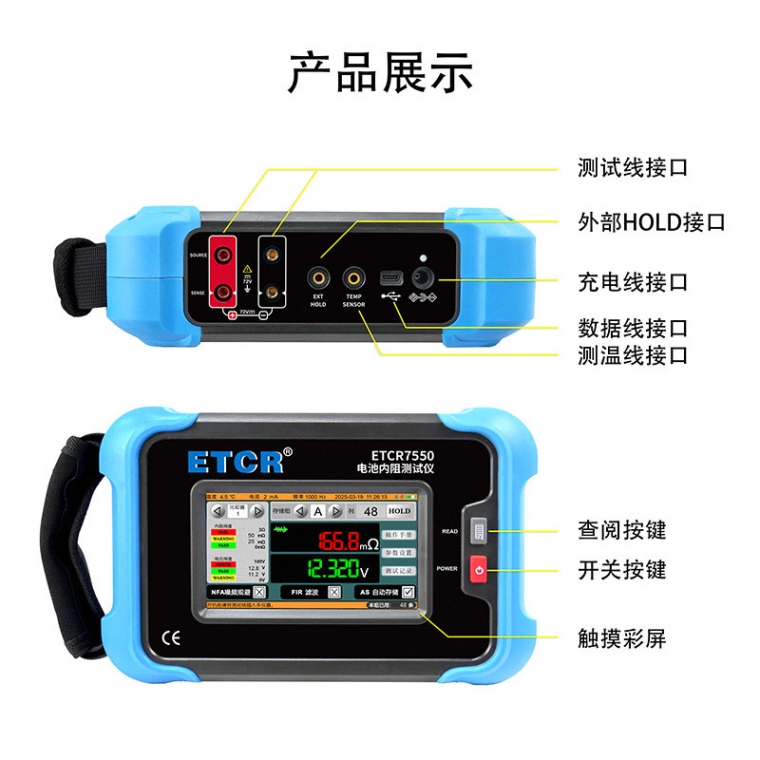 ETCR7550电池内阻测试仪又称充电电池测试仪、电池测试仪,本仪器是用于测量铅蓄电池、镍镉、镍氢电池、锂电池的内阻、电压、温度以判断电池健康状态的测量仪器。本仪表使用开尔文交流4线法测量电池内阻,可不受测试线、端子与电池电极之间接触电阻影响测量正确的测量值。