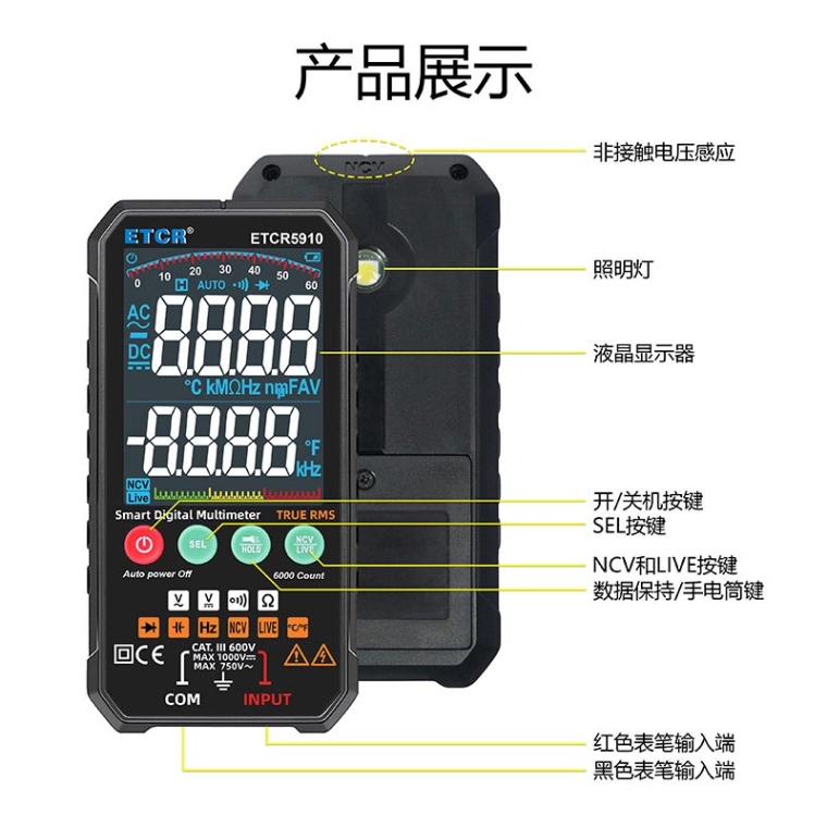 本仪表是一款6000计数的手持式数字智能万用表。具有测量数据快,大屏幕液晶双显示屏,并有照明灯,用户容易读数。具有过载保护和电池欠压指示等功能。无论专业人员、工厂、学校、爱好者或家庭使用,均为一台理想的多功能仪表。