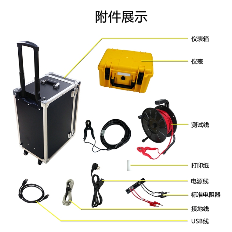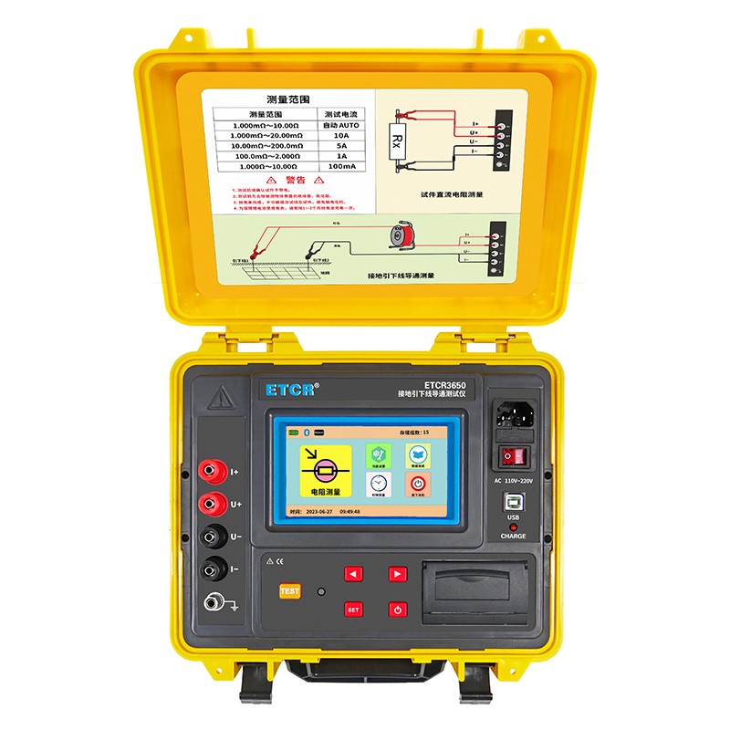 一.简介 ETCR3650接地引下线导通测试仪适用于电力设备接地引下线与接地网(或相邻设备)之间导通电阻值的测量,可有效检测电气设备与地网之间引线电阻因各种原因引起的电阻值增大的情况,以免造成设备失地运行。电力行业标准 DL/T475-2017《接地装置特性参数测量导则》规定:电气导通性应选用专门的仪器进行测量,仪器分辨率为 1mΩ,准确度不低于 1.0 级。 ETCR3650接地引下线导通测试仪专门用于接地装置的电气完整性测试,其各项技术指标均达到或优于相关标准要求。仪器由主机、测试线等组成,仪表采用微处理机技术,精密四线法测试,准确可靠。仪表有AC220V及大容量锂电池两种供电模式,自动测量及手动测量两种测量模式,仪表采用5寸全彩高清触摸屏,带背光调节功能,强光下清晰可见。仪表外壳采用防水保护箱,防撞、防摔、防水坚固安荃耐用,仪表带有内置打印机、蓝牙通讯,USB接口。仪器操作简单方便、精度高、测试速度快,复测性好、读数直观,是符合规程要求的理想的专用仪器,大大方便了试验项目的开展,提高了工作效率。 二.功能特点 1、仪表有两种供电模式,AC 220V及内置大容量锂电池,满足用户在各种场合使用的要求。 2、两种测量模式,自动测量模式:可根据负载自动选择测试电流。手动测量模式:有4档测试电流100mA、1A、5A、10A可选。 3、zui大输出电压24V,zui大测试电流10A,测试速度快。 4、采用 5寸真彩液晶触摸屏,测量操作触屏/按键两用。 5、内置打印机,可在现场打印测量结果。 6、带有蓝牙通讯,安装APP后可在手机进行测试操作或查看测试结果。 7、仪表具有USB接口及监控软件,与电脑通讯后具有历史数据读取、查阅、保存、报表、打印等功能。 8、具有放电功能,测试后自动放电,放电指示清晰,避免误操作。 9、报警功能,可设置电阻报警值。 10、自动关机功能,设置自动关机后,无操作15分钟后自动关机。 三.技术规格