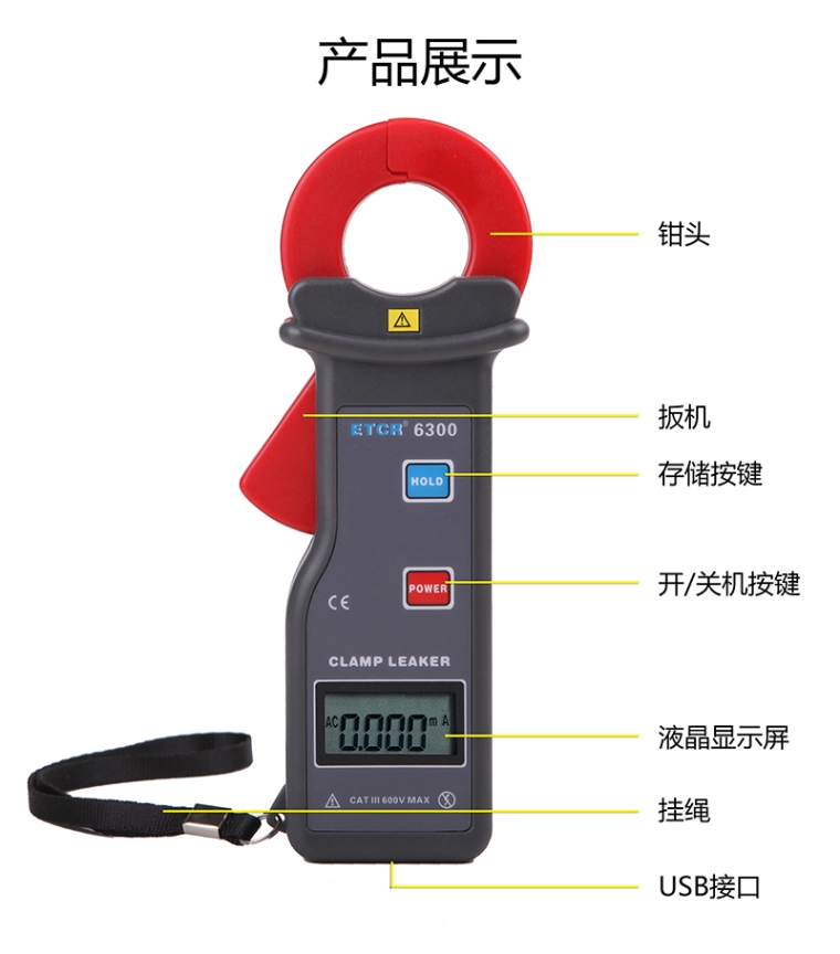 ETCR6300 | 钳形漏电流表 | AC 0.000mA~60.00A | 1uA |