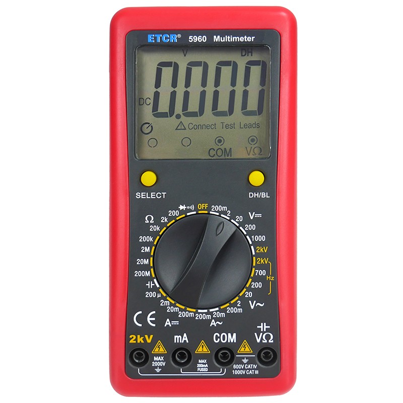 ETCR5960万用表2000V款,能测量直流电压和电流、交流真有效值电压和电流、电阻、电容、二极管正向压降、电路通断等。