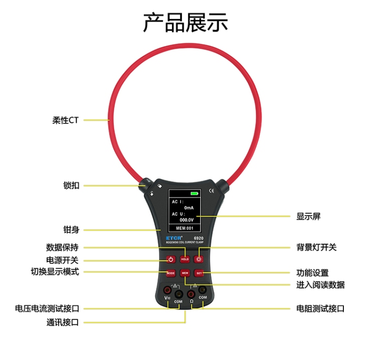 ETCR6920B | 0mA~10000A | 0.0V~750V AC 0.0V~1000V DC | 0Ω~2kΩ | / | Φ300mm |