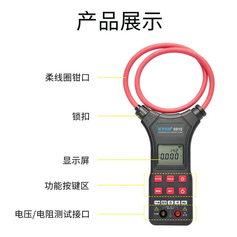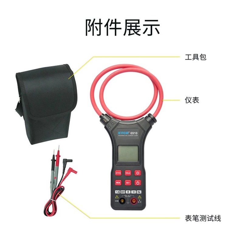 ETCR6910多功能柔性电流钳表又称柔性线圈电流表、罗氏线圈电流表。用于现场测量交流电流(真有效值)、交流电压、直流电压、电阻,还有通断测试、频率识别、蓝牙通讯等功能。特别适合排线密集的场所、粗大导线电缆测试、可控硅整流、变频调速、半导体开关、功率电子转换设备、电弧焊接等信号严重畸变的工业环境的电流测试。广泛适用于电力、通信、铁路、油田、建筑、科研教学、工矿企业等领域,是电工**检测的必备工具。 柔性电流钳,即RogowskiCoil(罗氏线圈),是一个在非铁磁性材料上均匀缠绕的环形线圈,无磁滞效应,几乎为零的相位误差,无磁饱和现象,线性度极高,抗干扰能力强。输出信号是电流对时间的微分,通过对输出电压信号进行积分,就可以真实还原输入电流,其测量电流范围可从毫安级到上万安。柔性电流钳线圈部分无任何裸露金属导体,非接触测量,**快速;其体积小、重量轻、外观精美、柔软灵活,适合于狭窄环境和排线密集的场所;测量精度高、可靠性强、响应频带宽,用户可根据需求定制线圈长度。仪表还具有自动关机功能,背光功能、数据保持功能。 产品特点 1、柔性线圈无任何裸露金属导体,体积小、重量轻、柔软灵活,适合大尺寸导体、狭窄环境和排线密集的场所。 2、多功能,可测试交流电流、交流电压、直流电压、电阻及通断测试。 3、同屏显示多项测量参数,操作方便,可作为普通万用表使用。 4、存储功能:数据存储600组。 技术参数 1、量程及误差