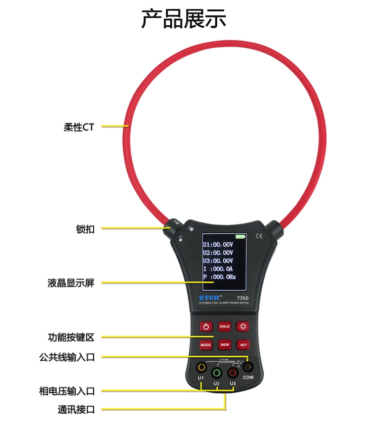 ETCR7350柔性钳形功率表体积小、重量轻,现场操作非常轻便简易,测量精度高,仪表具有USB通讯接口,可存储数据,通过系统软件上传所存数据到电脑,实现历史数据读取、查询、保存、打印等功能。仪表还具有背光功能、数据保持功能,是电工**检测的必备工具。