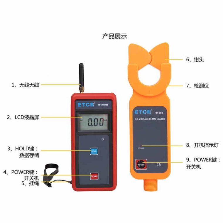ETCR9100B无线高低压钳形电流表连接绝缘杆,可用于69kV以下的高压线路漏电流测量,在线电流测量,判断氧化锌避雷器是否受潮或运行不好,仪表还具有峰值保持、数据保持、数据存储、无线传输等功能,其专用高压钳通过按压或退拔绝缘杆能方便钳夹或撤离被测导线,省时快捷,广泛应用于变电站﹑发电厂﹑工矿企业以及检测站﹑电工维修部门进行漏电检测和野外电工作业等。