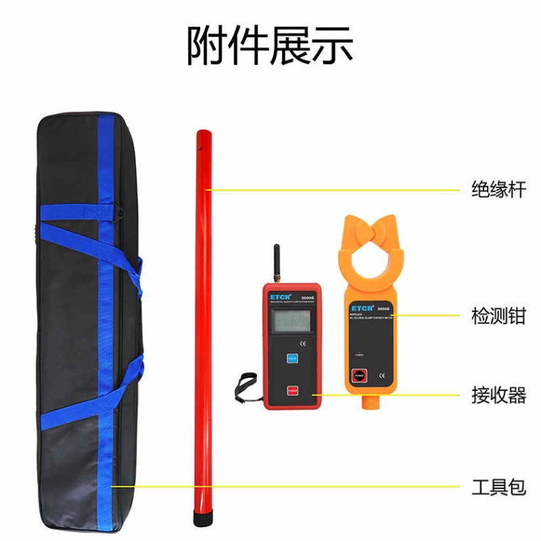 ETCR9000系列高低压钳形电流表连接绝缘杆,可用于60kV以下的具有绝缘外皮的线路或35kV以下裸导线高压线路电流测量,在线电流测量,还具有峰值保持、数据保持、数据存储、无线传输等功能,其专用钳形电流表通过按压或退拔绝缘杆能方便钳夹或撤离被测导线,省时快捷,广泛应用于变电站﹑发电厂﹑工矿企业以及检测站﹑电工维修部门进行电流检测和野外电工作业等。也可以取代高低压变比测试仪,即分别测出一次回路与二次回路的高低压电流,再计算就能得出高低压的变比。绝缘杆轻便,具有防潮﹑耐高温﹑抗冲击﹑抗弯﹑高绝缘、可伸缩等特点。
