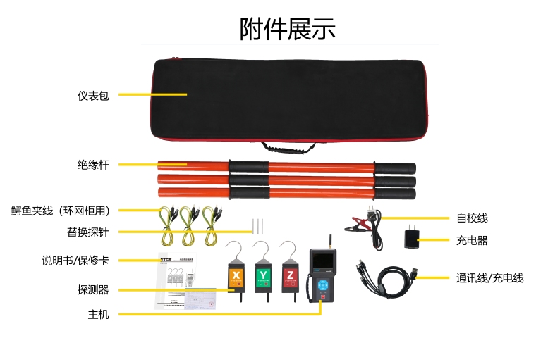 2. ETCR1050无线高压相序测试仪由主机、探测器、伸缩绝缘杆、数据上传软件、USB通讯线等组成,主机采用3.5寸真彩液晶屏,可以同屏显示相位、频率、相序及核相结果;向量图指示、相位指示,清晰直观;具有“X信号正常、Y信号正常、Z信号正常、正相序、反相序、同相、异相”等语音提示功能,使测试更简单轻松。