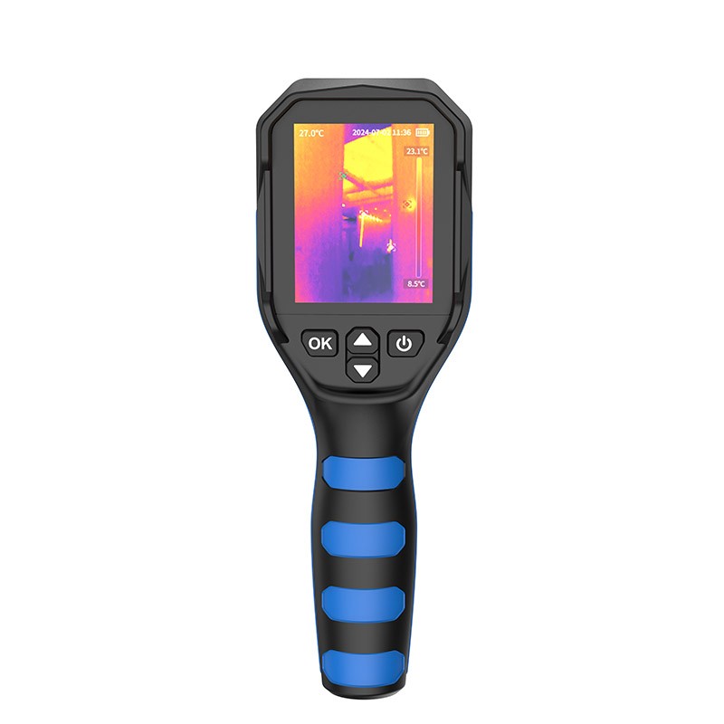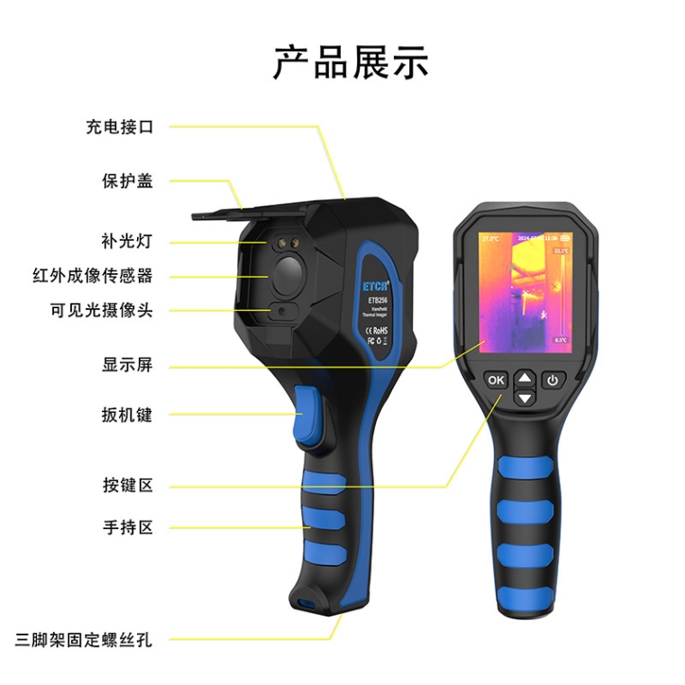 ETB256手持式红外热成像仪是一款手持式测温红外热成像仪,又称热成像仪、温度分析仪等,其分辨率为:256×192。是测温、成像一体的多用途热像仪;可进行实时观察图像、温度分析等功能,是电工和维修人员快速定位故障区域的理想选择。