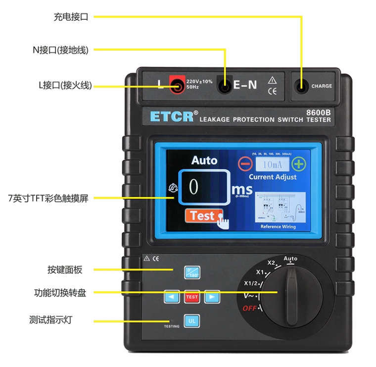 ETCR8600B | 5~1000mA | 0~999ms | 0~600V | 有 | 彩色触屏、测试电流及倍率选择、相位角度选择 |