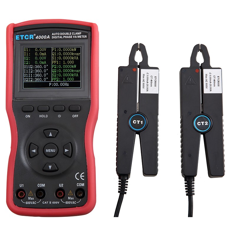 ETCR4000A智能型双钳数字相位伏安表(又称:全自动双钳数字相位伏安表)是我公司精心研制的一款专为现场测试的全自动、多功能、数字式、智能型仪表,是对机械旋钮式相位伏安表的升级,减少了操作的繁琐性,降低了误操作的可能性,具有高精度、高稳定、低功耗、使用方便等特点。可以在被测回路不开路的情况下,同时测量两路交流电压、电流、电压间相位、电流间相位、电压电流间相位、频率、相序、有功功率、无功功率、视在功率、功率因数等,判别变压器接线组别、感性、容性电路,测试二次回路和母差保护系统,读出差动保护各组CT之间的相位关系,检查电度表的接线正确与否,检修线路设备等,为用电检查人员提供一种安荃、准确、便捷的新型电力仪表。