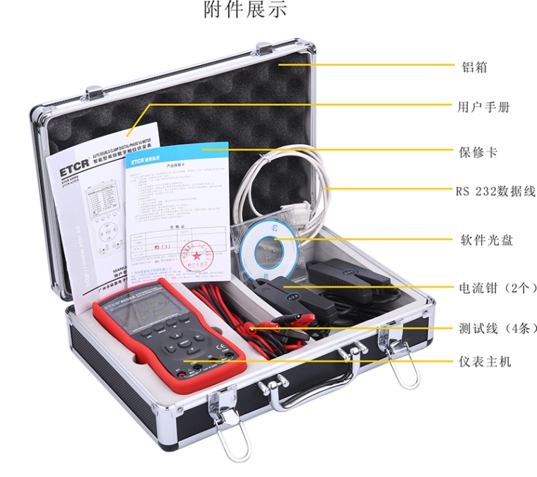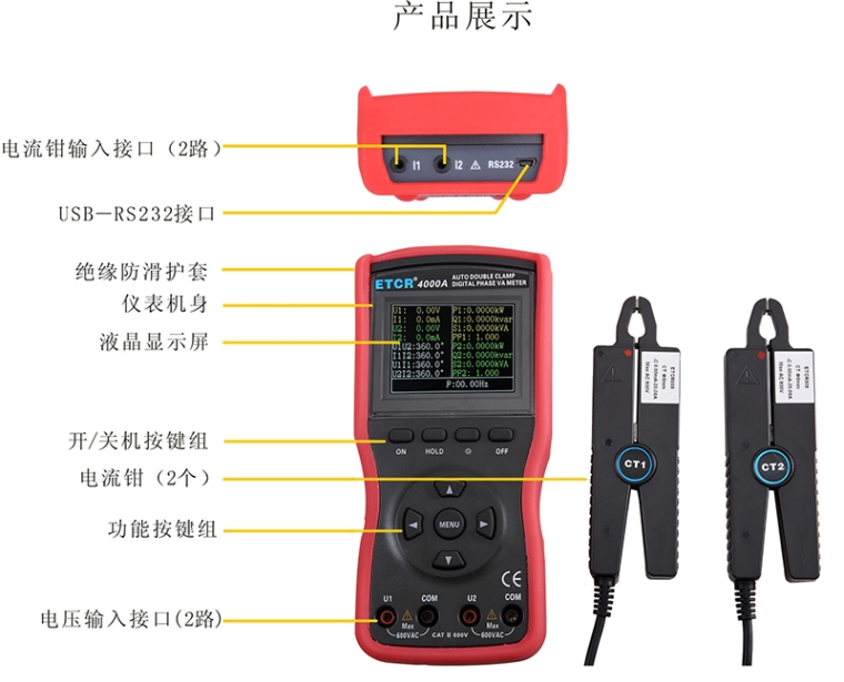 ETCR4000A智能型双钳数字相位伏安表选用新型材料设计制作外壳模具,配有的防振、防滑、高绝缘护套,采用2.8寸TFT彩色液晶屏,所有参数同屏显示,一目了然,尽显精美豪华外观。仪表配有USB-RS232接口,可存储1200组数据,通过系统软件上传所存数据到电脑,实现在线实时监测与历史查询,动态显示,能读取、保存、报表、打印历史数据等。同时,尖小形钳口适合于排线密集的地方,能满足不同场所需求。