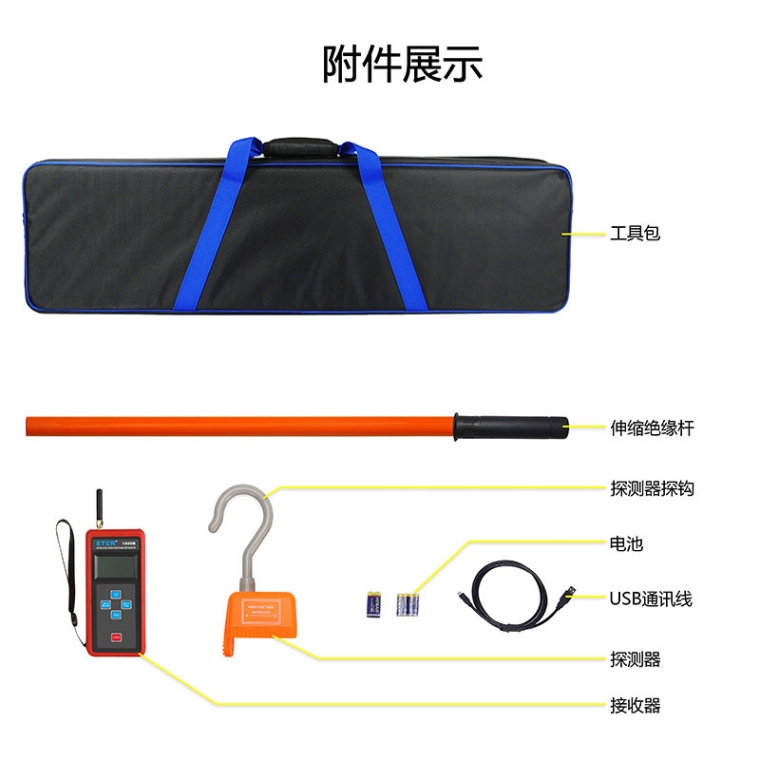 ETCR1800系列无线高压验电器由接收器、探测器、伸缩绝缘杆、监测软件、USB通讯线等组成,测试时只需用绝缘杆把探测器挂在裸导线上,通过无线信号传输即可在手持接收器上读取电压值,一目了然非常直观,操作非常方便。无线信号直线传输距离约30米,探测器有红色LED和蜂鸣器等声光报警,使测试更简单轻松。