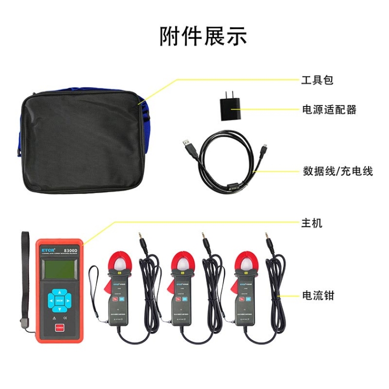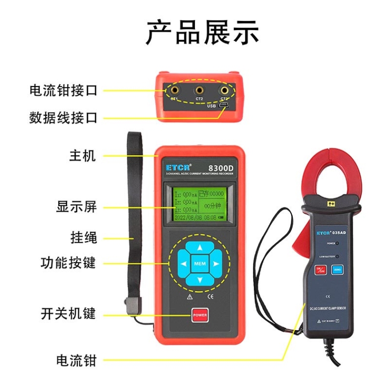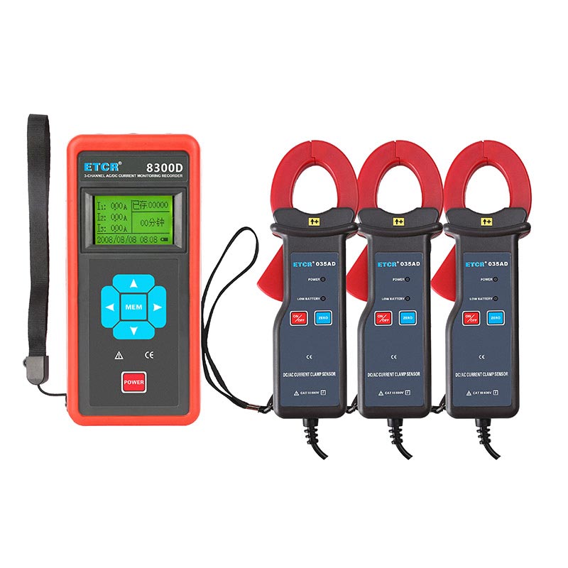 ETCR8300D三通道直流/交流电流记录仪又称多通道电流记录仪,用于现场在线同时监测、记录1~3路直流或交流电流,故障查找,线路检修。仪表由记录仪主机、电流钳、充电器、数据上传软件、通讯线等组成,可广泛应用在380/220V电力系统中,为用电检查人员提供**、准确、便捷的电力仪器。 ETCR8300D三通道直流/交流电流记录仪主机采用LCD显示,三通道同屏显示,一目了然,有中文操作界面和英文操作界面两款选择,适合于不同国家的工程技术人员。记录仪采用大容量可充电锂电池,续航*多可以持续记录72小时。具有系统时钟功能和超大存储空间,能现场设定监测记录时间,能存储20万组数据,具有自动存储间隔时间设定功能,记录周期从1秒~99分钟内设置。配有USB通信接口数据上传软件具有历史数据读取、查阅、保存、报表等功能。 产品特点 1、电流钳选用坡莫合金制作,确保了常年无间断监测的高精度、高稳定性、高可靠性。 2、主机可配置1至3个电流钳,用户根据需求选型。 3、可设置记录间隔时间。 4、存储功能,20万组数据超大存储空间。 5、可充电锂电池,节电模式下连续工作约72小时,更换电池不会丢失数据。 6、USB通信接口。 技术参数