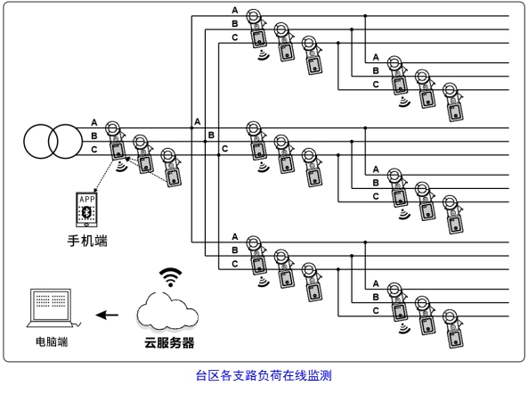 四、台区支路负荷监测 在低压台区供电系统中:由于用电量随季节性变化起伏很大,相邻台区因用户数量及变压器容量的差异,在用电高峰期的负载率也有较大差异,而变压器的经济运行负载率在70%左右,为了保障在用电高峰期变压器不会超负荷运行及在用电低谷期变压器负载率又不至于过低,维护人员需要经常将部分负荷在相邻台区间进行割接电操作。以往由于割接作业时无法事先掌握台区各支路的负荷情况,以及被转供电的负荷真实的负载记录,割接作业具有较大的盲目性,常常出现施工后效果较差,甚至由于切割的负荷过大导致受方台变负载率过高。 使用多组ETCR8080无线三相电流监测仪(又称智能台区负荷割接分析仪)对在即将实施转供切割的负荷实时监测一段时间,对监测负荷的数据进行记录及分析,为台区负荷转供割接提供准确的数据,避免盲目切割负荷,有效解决台变负载率严重不均的问题,为保障设备安荃、经济运行提供了技术手段。用户还可以通过后台观察负荷的数据及电流趋势图,观察台区及支路的三相不平衡情况。该方法适用于多种类型城市配电网,应用前景广泛。